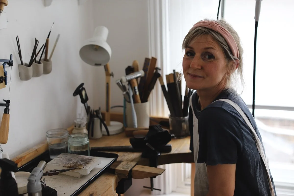 A woman working in a woodworking studio, surrounded by various tools and supplies, sitting at a workbench.