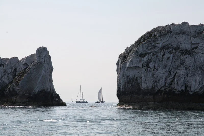 Two sailboats sailing between large rocky cliffs by the sea on a clear day.