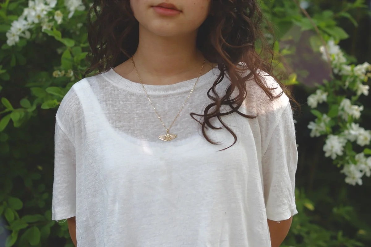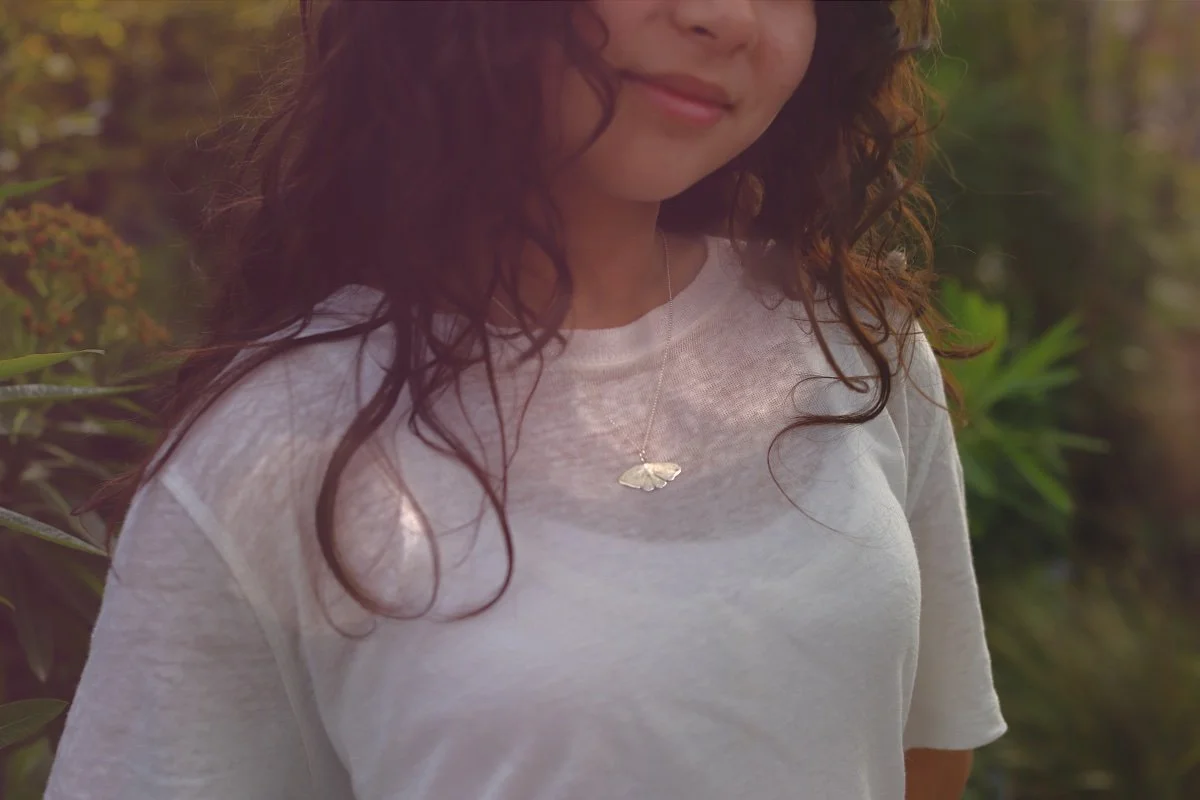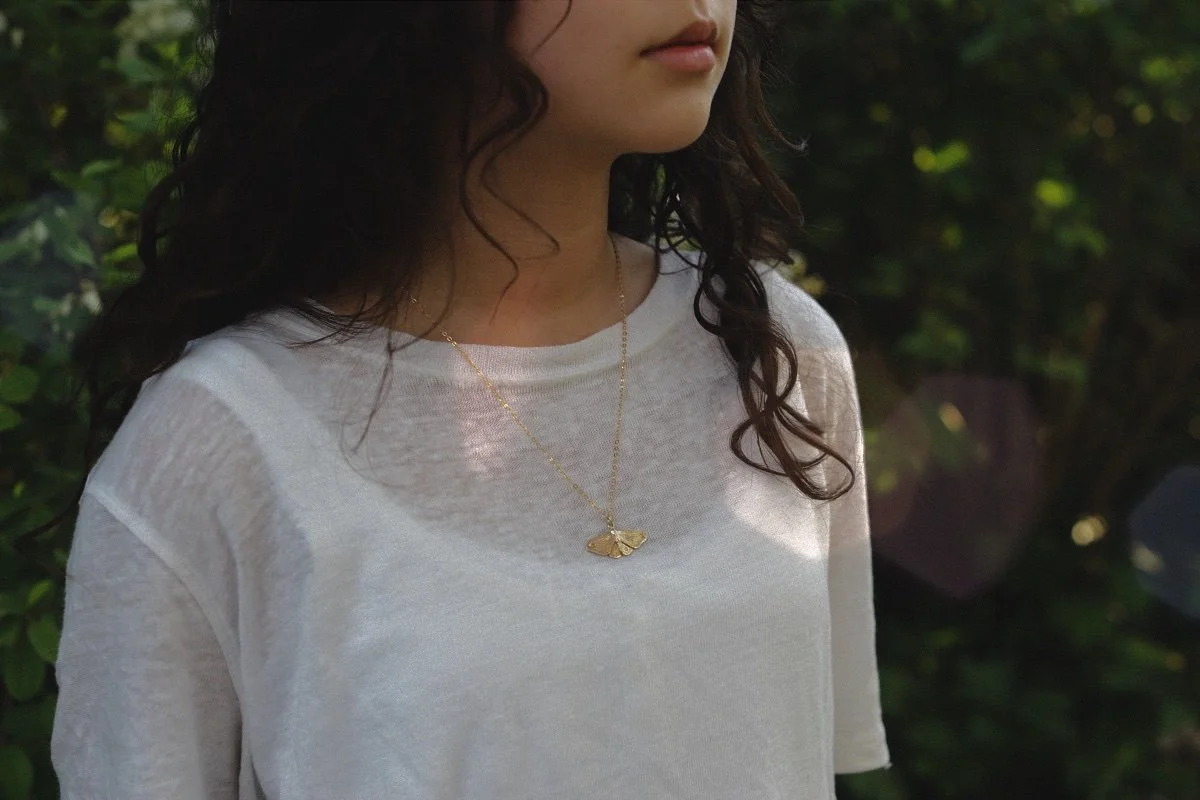 The light is beautiful this time of the year, when the sun begins to dip and it illuminates all the leaves on the trees. I’m very lucky that my daughter wanted to do some modelling for me, with some new bronze versions of the Folklore collection, and also a new moth pendant that can be purchased separately to the chain, also available in bronze, coming soon!