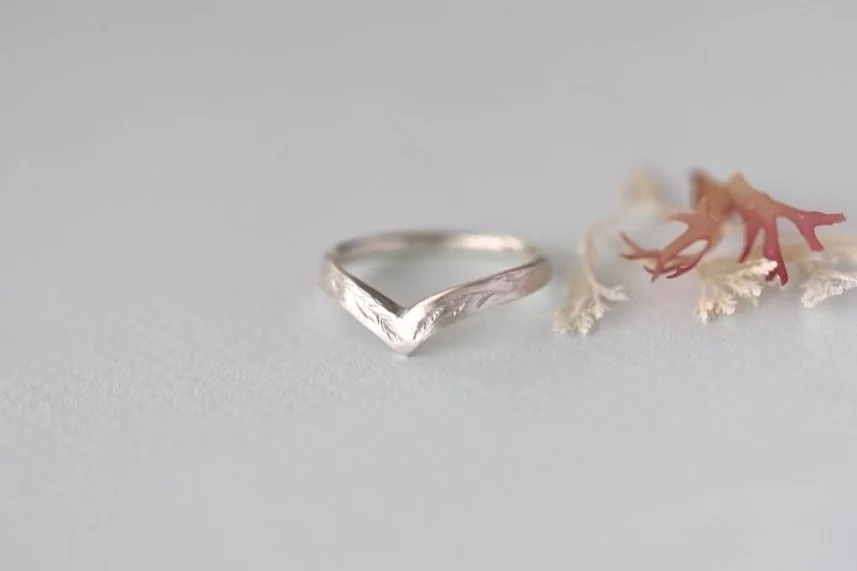 This little ring has a marquise shape with tiny delicate grass seeds engraved. Wishing you well everyday.